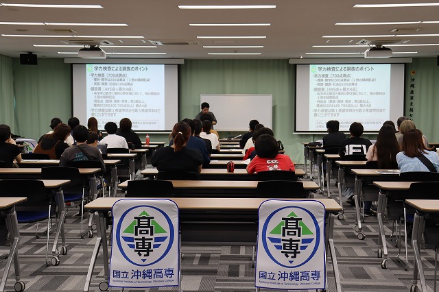 学校説明会では4学科の説明・沖縄高専の特色・学生寮生活の説明・アドミッションポリシー