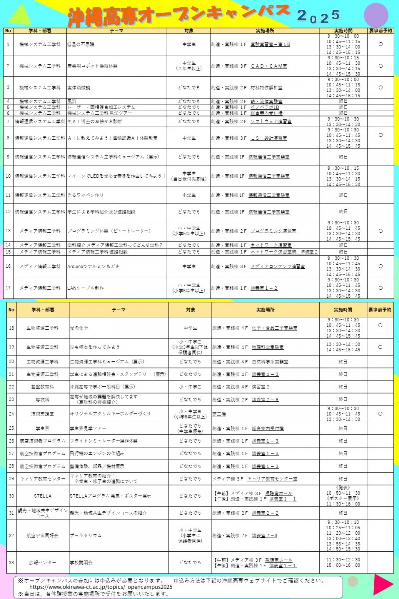 No | 学科・部署 | テーマ | 対象 | 実施時間 | 要事前予約 |